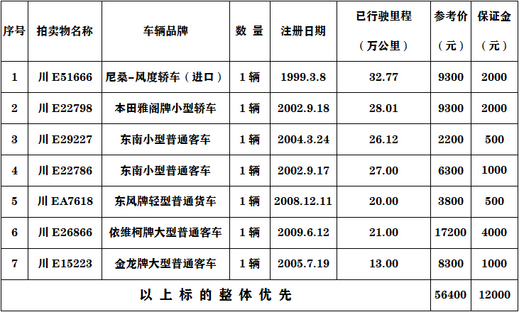 五、凡有意競買者請于2020年3月26日16:00時前將保證金匯入本公司指定賬戶(保證金以到賬為準(zhǔn)),并于2020年3月26日16:00時前持匯款依據(jù)及有效證件到拍賣會地點(diǎn)辦理競買手續(xù)。如成功競買后,保證金沖抵成交價款,未能競買成功,保證金全額無息退還,(保證金賬戶名稱:瀘州市四方拍賣有限公司,賬號:51001637708051501502,開戶行:建行瀘州世紀(jì)城支行)